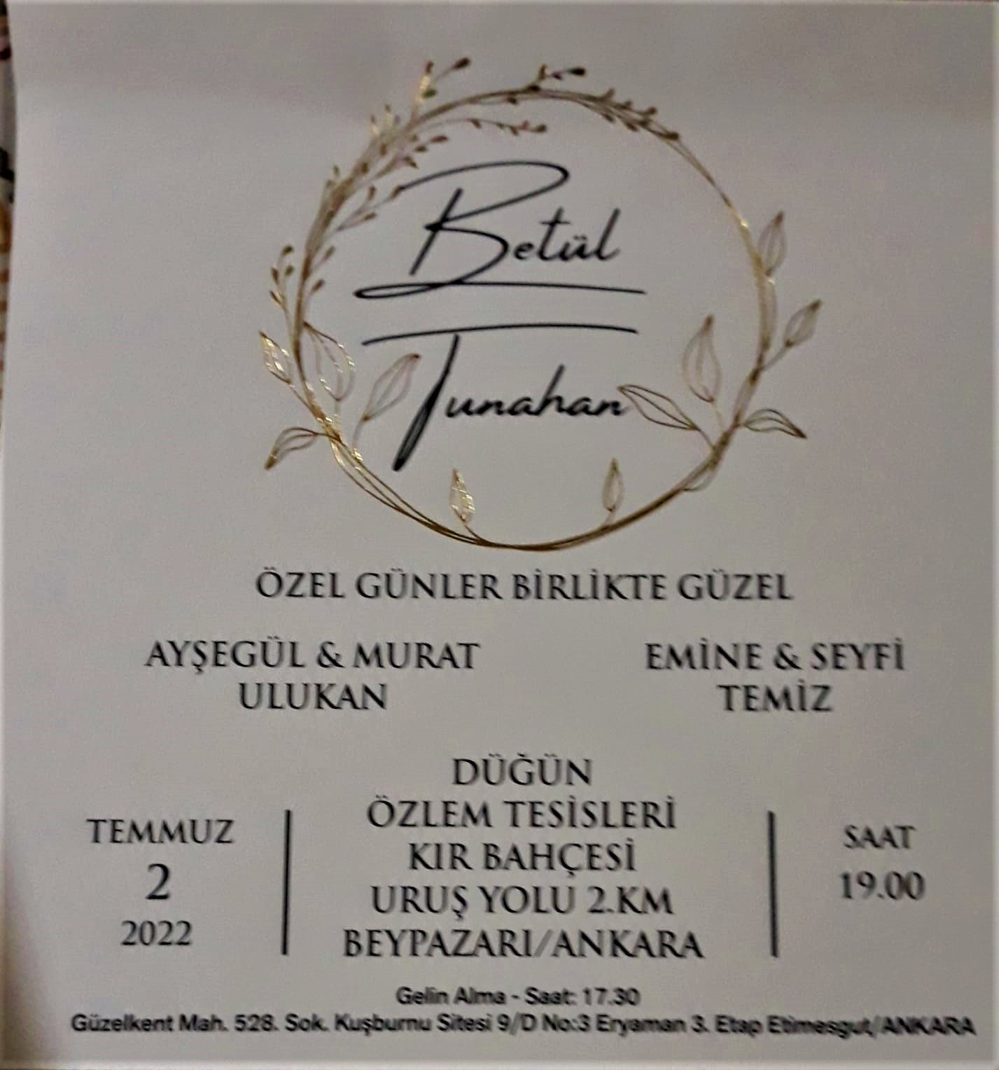 Sarıyar'ımız sevilenlerinden Ayşegül Ulukan-Murat Ulukan çiftinin biricik kızları Betül Ulukan ile Tunahan Temiz'in 02 Temmuz 2022 Cumartesi günü saat 19.00'da BEYPAZAR'ında düğünü var düğünümüze tüm dostlarımızı bekleriz.Genç çiftlerimize bir ömür boyu sonsuz Mutluluklar dileriz.Allah Mesut Etsin.26 Haziran 2022