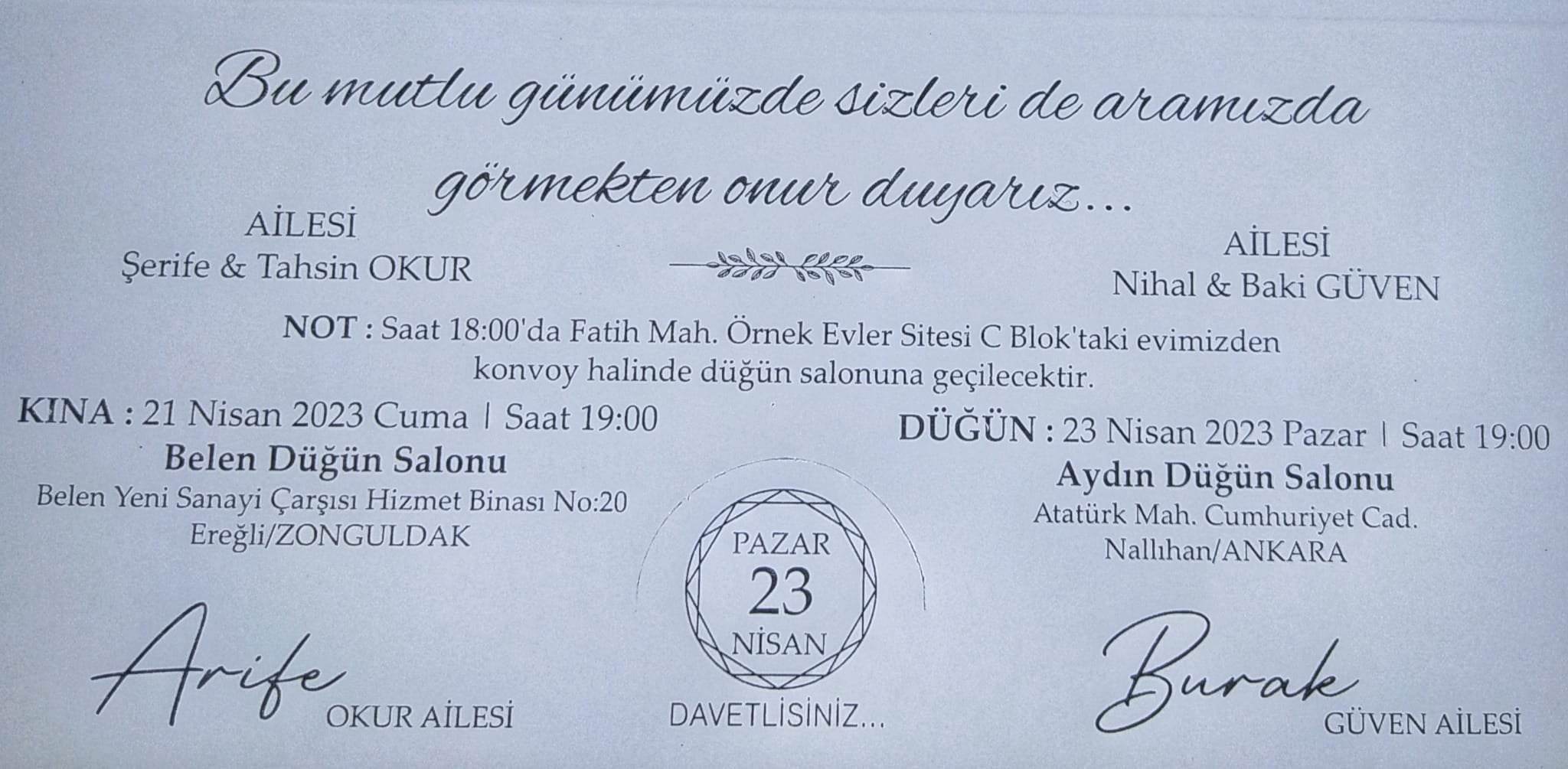 Rahmetli Kadir Ertuli'nin kızı Nihal-Nallıhanlılar Grubu Yönetici Baki Güven çiftin oğlu Burak Güven ile Arife Okur'un 23 Nisan 2023 Pazar günü saat 19.00'da Nallıhan Aydın Düğün Salonundaki düğünleri vardır.Yaşama dair ne varsa her anında birlikte olmaya karar verilen bu tekrarı olmayan bu mutlu günde beraber olmanız gençlerimize ayrı bir mutluluk verecektir.22 Nisan 2023
