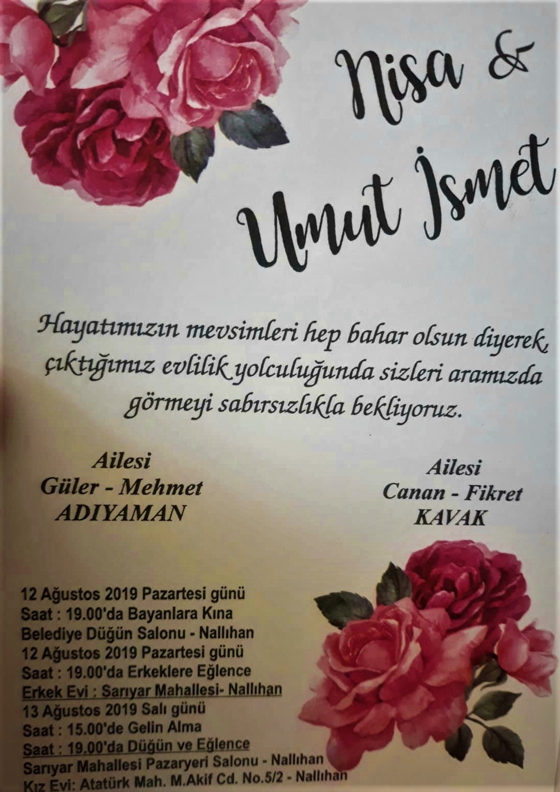 Biz çok sevdik birbirimizi, bağırarak söyleyeceğiz “evet”imizi, ne çok isteriz şahitliğinizi, sosyal medyadan çağırıyoruz ama bilin düğünümüze mutlaka beklendiğinizi.30 Temmuz 2019