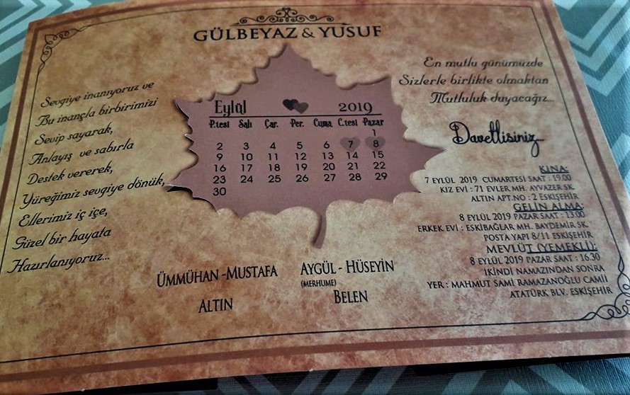 Allah’ın emrine uyuyoruz, Mutlu bir yuva kuruyoruz. Allah’tan saadet diliyoruz, Bu mutlu günümüze, Sizleri de bekliyoruz.03 Eylül 2019