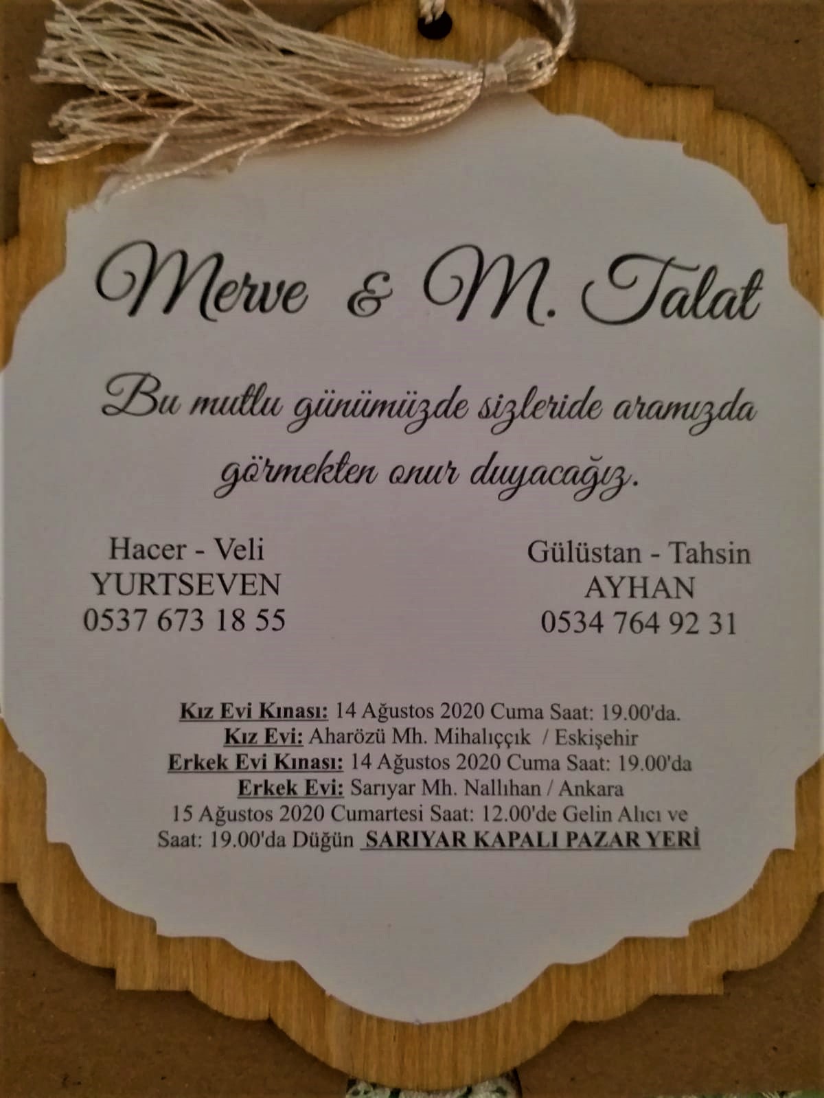 Sarıyar'ımız sevilenlerinden Gülüstan-Tahsin Ayhan çiftin Sarıyar'ımız Tek İşletmesinde çalışan oğlu Mustafa Talat Ayhan ile Hacer-Veli Yurtseven'in kızı Merve Yurtseven'in 15 Ağustos 2020 Cumartesi günü saat 19.00'da Sarıyar'ımız Kapalı Pazar yerinde düğünleri var.