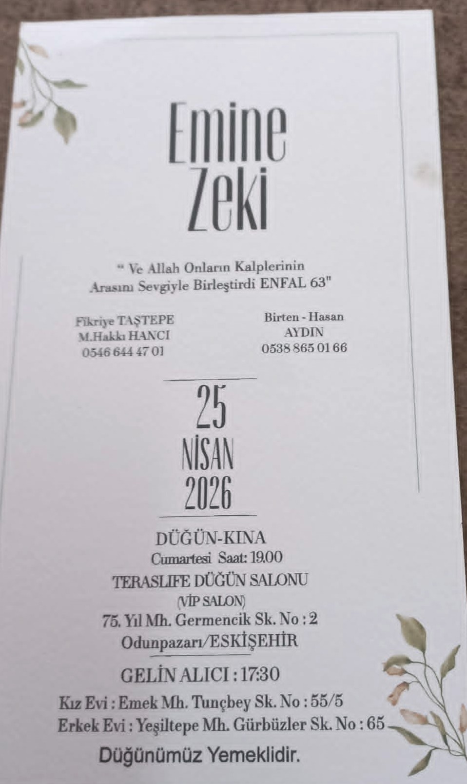 Sarıyar'ımız rahmetli Abdullah Hancı-Emine Hancı'nın torunu,Hakkı Hancı-Fikriye Taştepe'nin kızları Emine Hancı ile Zeki Aydın'ın 25 Nisan 2026 Cumartesi günü saat 19.00'da Eskişehir'de yapılacak olan düğün törenimize tüm dostlarımızı bekliyoruz.Sonsuz mutluluklar diliyoruz.Allah Mesut Etsin.