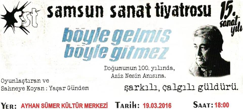 İlçemiz Nallıhan’da 19 Mart 2016 Cumartesi günü saat 18.00 de Samsun Sanat Tiyatrosunun ”Böyle Gelmiş Böyle Gitmez” isimli tiyatro oyunuAyhan Sümer Kültür Merkezindegösterime girecektir. 17.03.2016