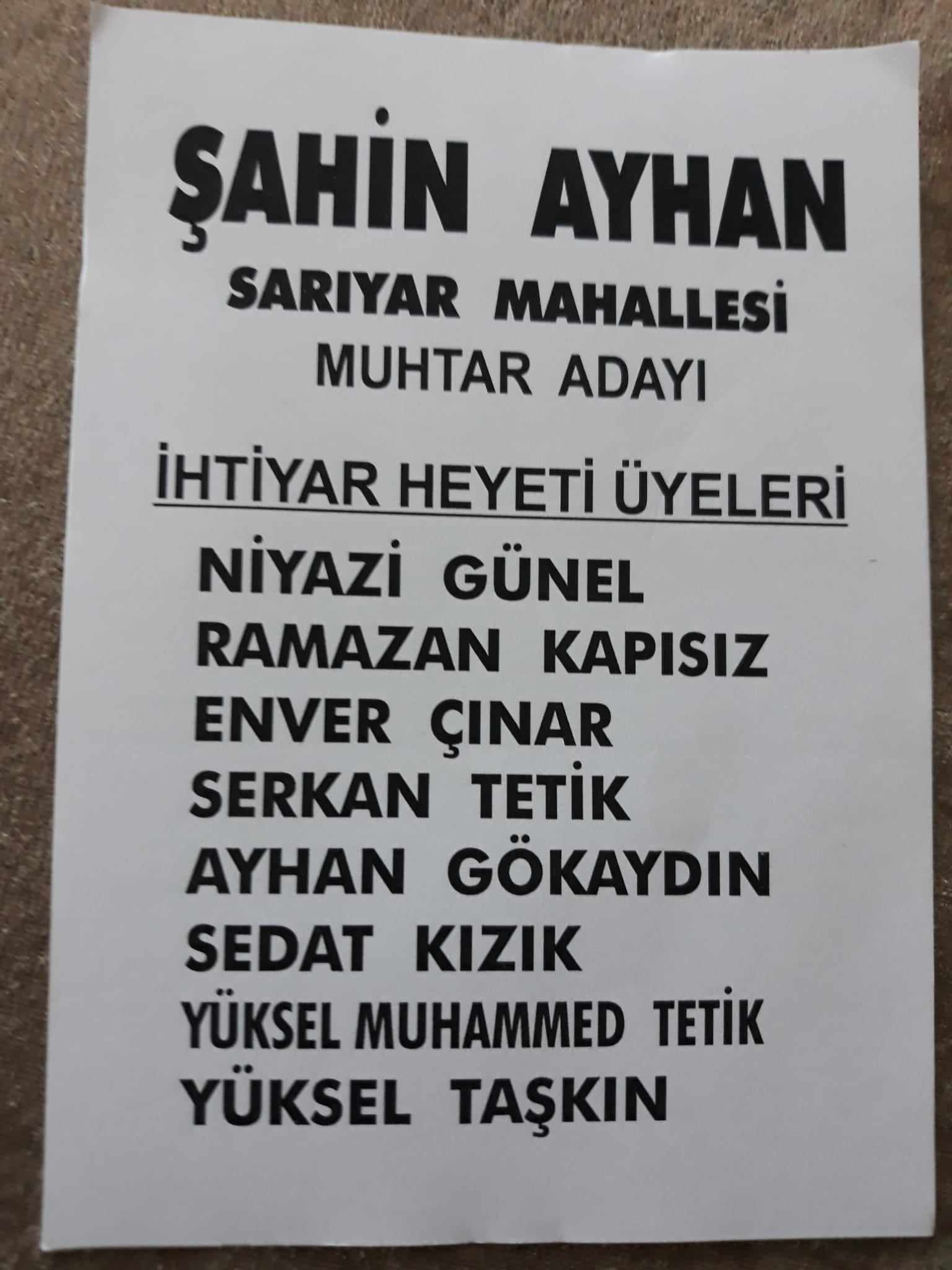 MUHTAR ŞAHİN AYHAN SARIYAR'IMIZDA YENİDEN ADAY31 Mart 2024 yerel seçimlerine kısa bir süre kala Sarıyar'ımızda muhtar adayları adaylıklarını açıklamaya devam ediyor. 2019 yerel seçimlerinde muhtar seçilen Şahin Ayhan Sarıyar'ımızdan tekrardan aday olduğunu söyledi.Ayhan yapmış olduğu açıklamada: 31 Mart 2019 yılında devir aldığımız muhtarlık vazifemizin 5. senesini doldurmak üzereyiz. Mahallemizde yapmış olduğumuz çalışmalar ve vermiş olduğumuz hizmetler doğrultusunda sizlerinde desteğiyle ilk günkü heyecanla, değişen ve gelişen Sarıyar Mahallemiz için sevgi, saygı ve hoşgörüyle 31 Mart 2024 seçimlerinde tekrar aday olduğumu sizlerle paylaşmak istiyorum dedi.