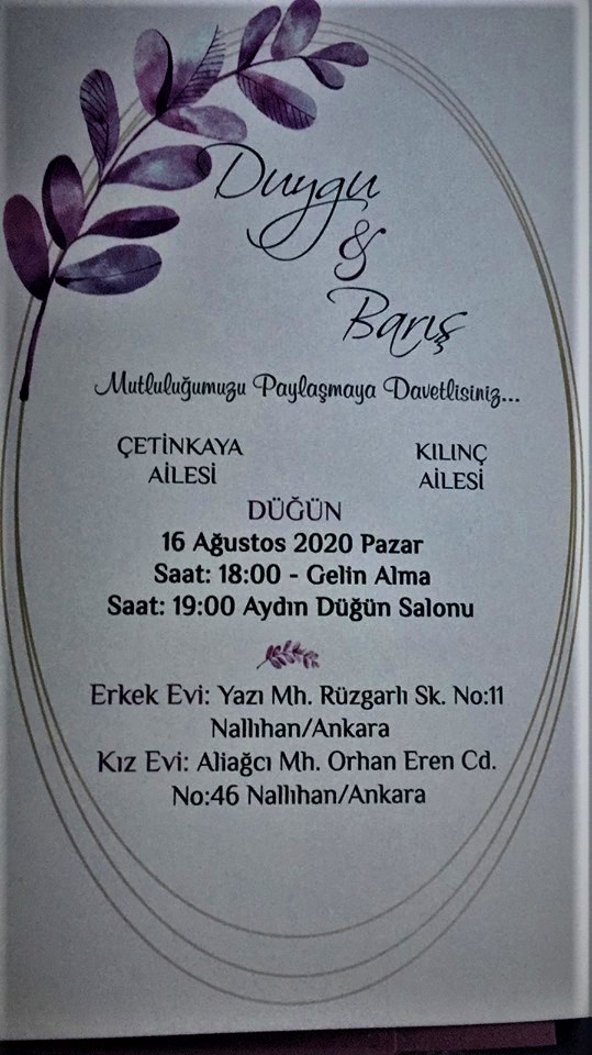 Sarıyar'ımız sevilenlerinden Yüksel Çetinkaya'nın torunu,Veysel Çetinkaya'nın sevgili kızıDuygu Çetinkayaile Barış Kılınç ile 16 Ağustos 2020 Pazar günü saat 19.00'da Nallıhan Aydın Düğün Salonunda düğünleri var