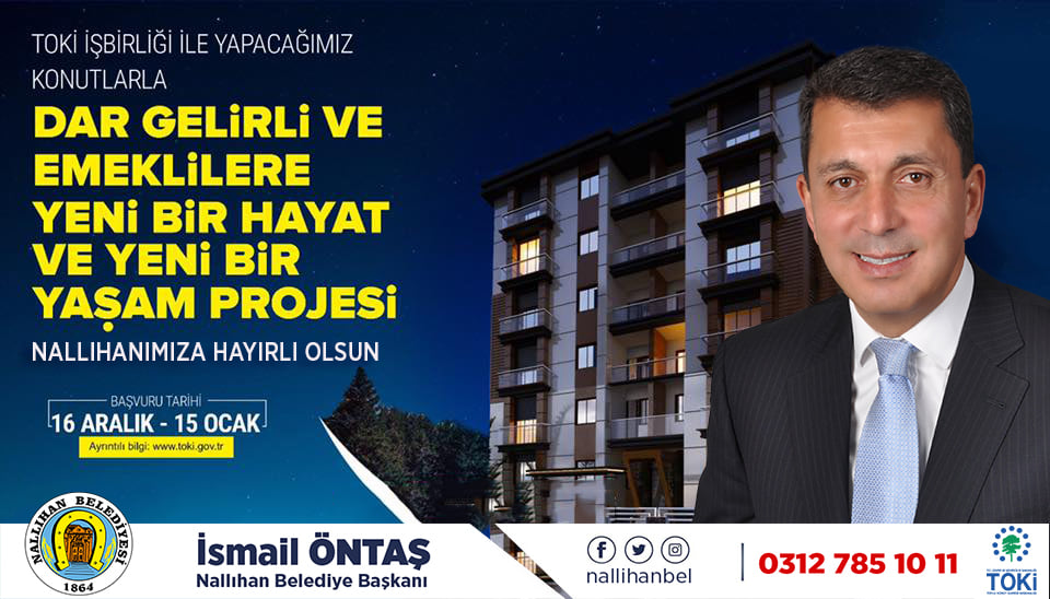 İlçemiz Nallıhan Belediye Başkanımız İsmail Öntaş’ın girişimleriyle Nallıhan Belediyesi ve TOKİ işbirliğinde dar gelirli ailelere yönelik konut projesi hayata geçiyor. İlçemize yapılacak 200 konut için başvurular 16 Aralık 2019 tarihinde başladı. Müracaatlardan sonra belirlenecek hak sahipleri kira öder gibi konut sahibi olacak.