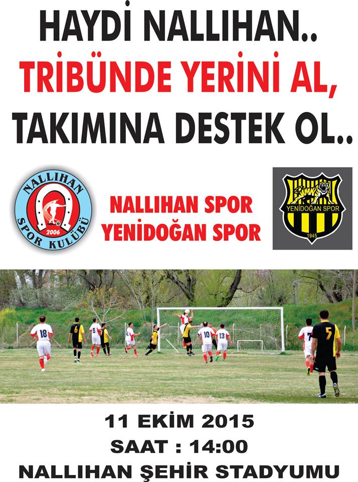 NALLIHAN SPOR KULÜBÜMÜZ İNŞALLAH BU SEZON YÜZÜMÜZÜ GÜLDÜRECEK 11 EKİM 2015 PAZAR GÜNÜ SAAT 14.00 DE YENİDOĞAN SPOR İLE YAPACAĞIMIZ BU MÜSABAKAYA TÜM FUTBOL SEVERLERİ NALLIHAN SPOR ŞEHİR STADYUMUNA BEKLİYORUZ.BİZDE SARİYARLİ.NET OLARAK NALLIHAN SPOR’UMUZA SONSUZ BAŞARILAR DİLERİZ.09 EKİM 2015