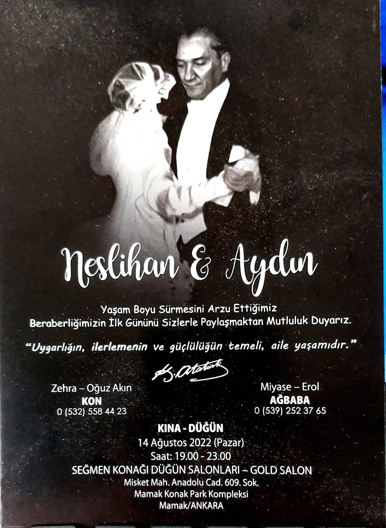 Sarıyar'ımız sevilenlerinden rahmetli Karahan Kon'un torunu,Zehra Ayhan Kon-Oğuz Akın Kon çiftinin sevgili kızları Neslihan Kon ile Aydın Ağbaba'nın 14 Ağustos 2022 Pazar günü saat 19.00'da Ankara'da yapılacak düğünlerine tüm dostlarımızı bekleriz.Birlikteliğimizin sonsuza kadar sürmesi umut ve dileği ile ortak yaşama adım attığımız bu günde sizlerle birlikte olmaktan mutluluk duyacağız.08 Ağustos 2022