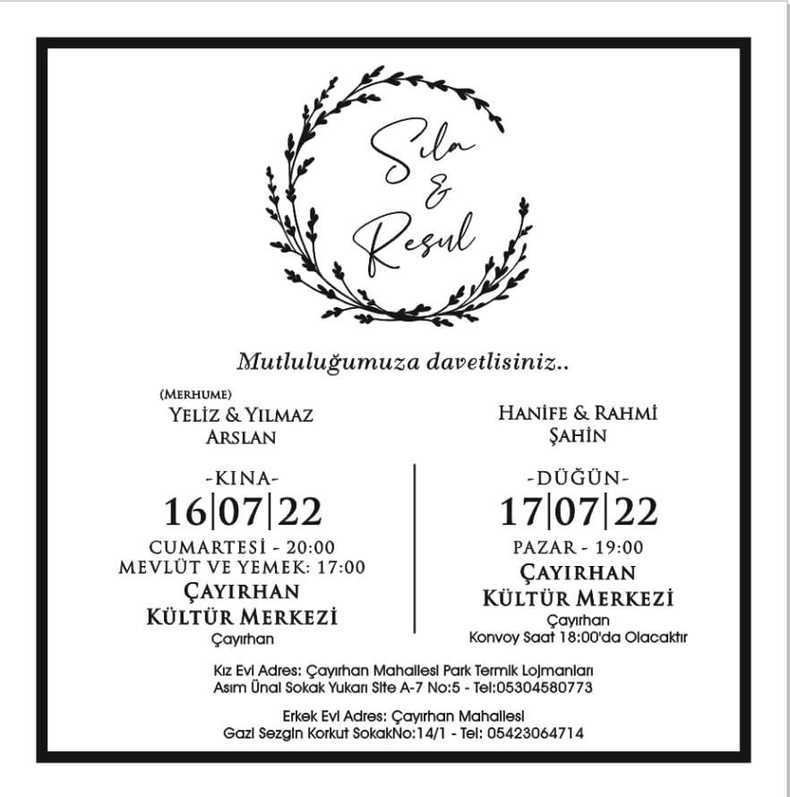 Sarıyar'ımız sevilenlerinden Rahmetli Yeliz Arslan-Yılmaz Arslan çiftin sevgili kızları Sıla Arslan ile Resul Şahin'in 17 Temmuz 2022 Pazar günü saat 19.00'da Çayırhan Kültür Merkezinde düğünü var düğünümüze tüm dostlarımızı bekleriz.Genç çiftlerimize bir ömür boyu sonsuz Mutluluklar dileriz.Allah Mesut Etsin.08 Temmuz 2022