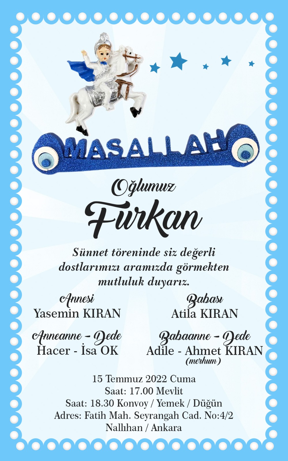 Sarıyar’ımız sevilenlerinden Yasemin Kıran- Atila Kıran çiftinin oğulları FURKAN'IN 15 Temmuz 2022 Cuma günü saat 17.00'de Mevlüt ,18.30 Konvoy Yemek ve Eğlencesi varTüm sevenlerimizi bekleriz.03 Temmuz 2022 Telefon:0546 454 35 58
